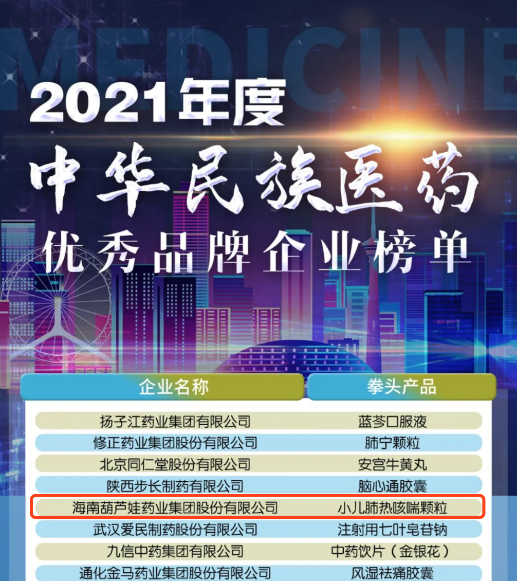 12月29日,全国工商联医药业商会发布了“2021年度中华民族医药优秀品牌企业榜单”,壹号娱乐药业集团凭借黄金单品小儿肺热咳喘颗粒(4克)实力登榜。